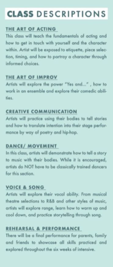The BX Arts Intensive Summer Camp is a 6-week youth performing arts program dedicated to helping talented young people find, practice and perfect their talents in acting, singing, dancing, rapping, improvisation, auditioning and presenting their best selves to the world.